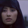 Description: black silhouette of woman wearing blue turban against blue background